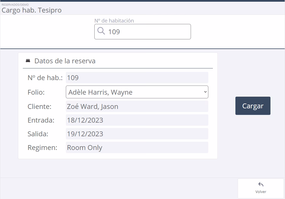 Si es posible realizar un cargo sobre la habitación buscada, aparecerá la información asociada a la misma.